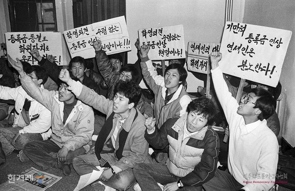 - 1989년 1월 17일 오후1시 연세대 학생들이 교내 도서관앞 민주광장에서 등록금 동결과 학생의 학사행정 참여 쟁취를 위한 2차 결의대회를 가진 뒤 본관 총장실 옆 소회의실에서 시한부 농성을 하고 있다