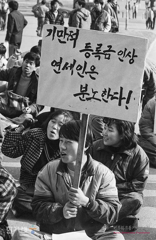 - 1989년 1월 17일 오후1시 연세대 학생들이 교내 도서관앞 민주광장에서 등록금 동결과 학생의 학사행정 참여 쟁취를 위한 2차 결의대회를 가진 뒤 본관 총장실 옆 소회의실에서 시한부 농성을 하고 있다