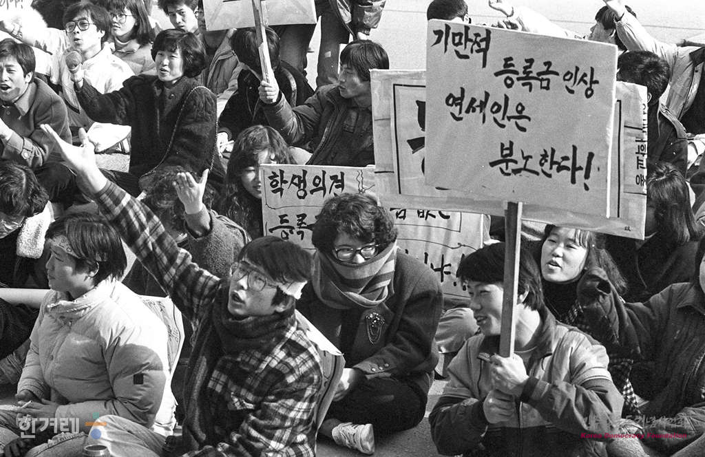 - 1989년 1월 17일 오후1시 연세대 학생들이 교내 도서관앞 민주광장에서 등록금 동결과 학생의 학사행정 참여 쟁취를 위한 2차 결의대회를 가진 뒤 본관 총장실 옆 소회의실에서 시한부 농성을 하고 있다
