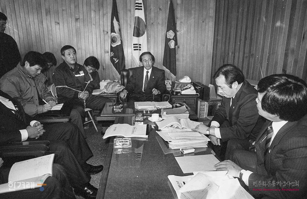 - 1989년 1월 17일 국회 노동위 현대테러사건 조사반은 울산경찰서 서장실에서 정보 대공과장 등 경찰 관계자와 수감중인 행동총책 이윤섭(제임스리)와 한유동 현대중공업 전무 그리고 현대중공업 노동자 정수철씨를 등을 불러 경찰과 회사쪽의 사전모의 혐의와 관련해 신문을 하고 있다.