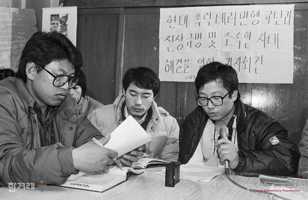 - 1989년 1월 19일 오후3시 권용목 전 현대엔진 노조위원장이 서울 용산구 갈월동 서울지역노동조합협의회 사무실에서 기자회견을 갖고 현대노조원 테러사건에 대한 철저한 진상규명과 책임자 처벌을 위한 국정조사권을 발동하고 청문회를 열 것을 요구하고 있다.
