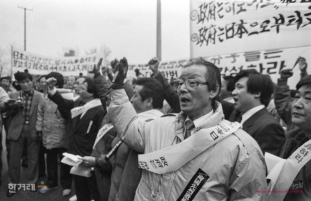- 1989년1월 19일 낮 12시 순국선열유족회, 독립유공자유족중앙회, 애국선열묘역녹화사업회, 독립유족협동자조회 등 4개 단체회원 1백여명은 서울 종로구 중학동 일본대사관앞에 모여 일제침략과 식민지배에 대한 일본 정부의 공식 사과를 요구하며 농성을 벌이고 있다.