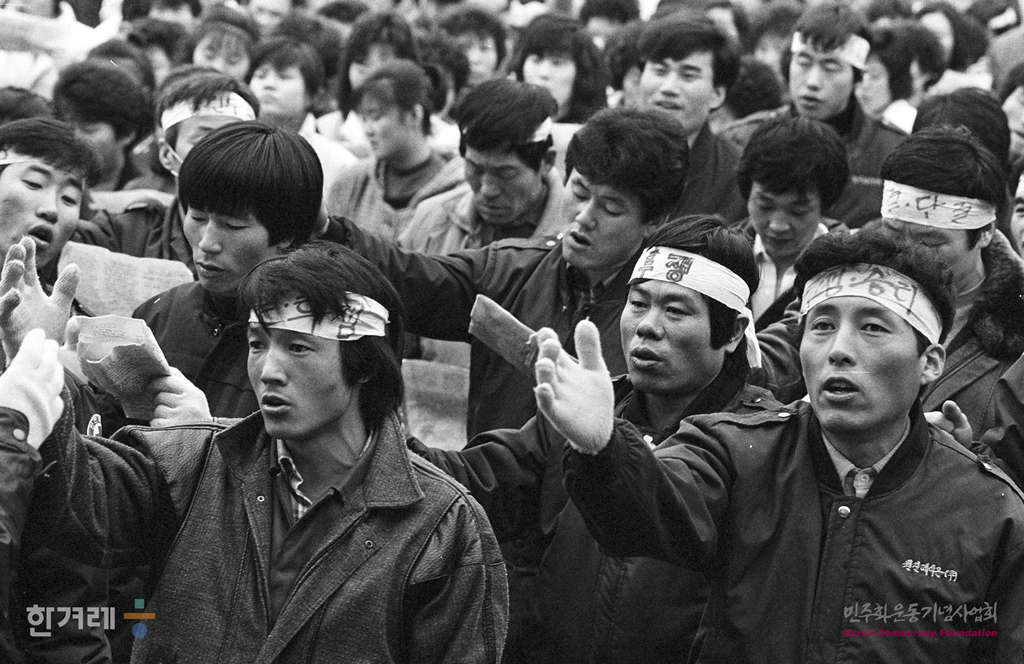 - 1989년 1월 21일 원진레이온 노동자들이 경기도 양주군 미금면 도농리 원진레이온 공장안에서 임금인상 등 단체협약 체결을 촉구하며 농성을 벌이고 있다.