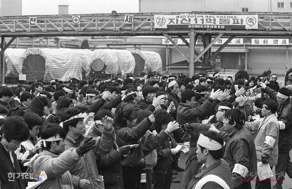 - 1989년 1월 21일 원진레이온 노동자들이 경기도 양주군 미금면 도농리 원진레이온 공장안에서 임금인상 등 단체협약 체결을 촉구하며 농성을 벌이고 있다.