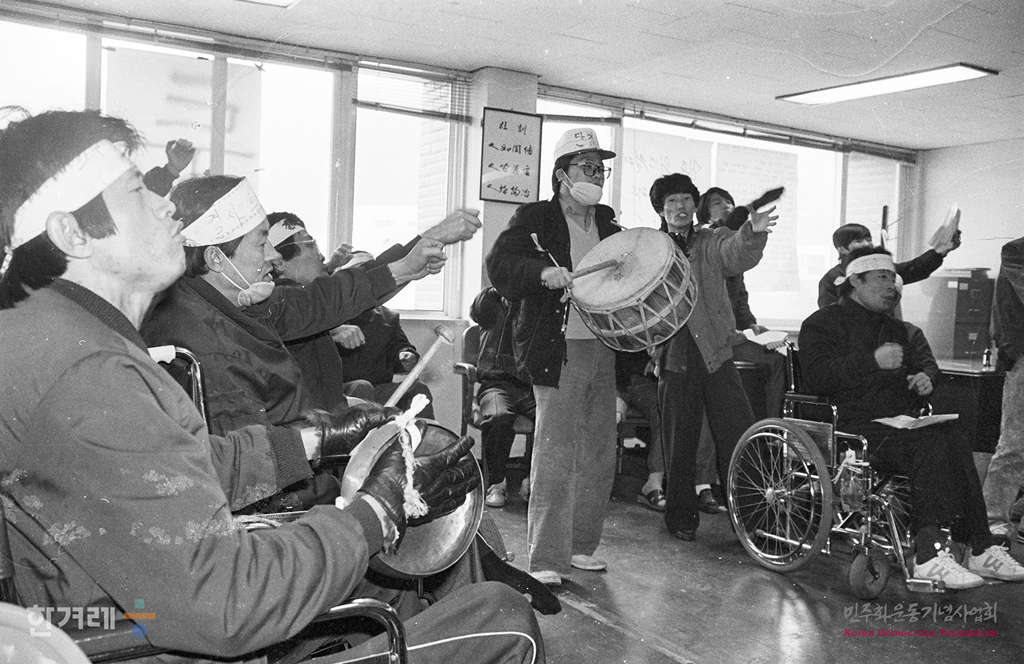 - 1989년 1월 20일 근로복지공사 반월 재활작업소에서 재활의 의지를 다지며 근무하는 산업재해 노동자들이 임금 인상과 영구직장 보장 등을 요구하며 시위를 벌이고 있다.