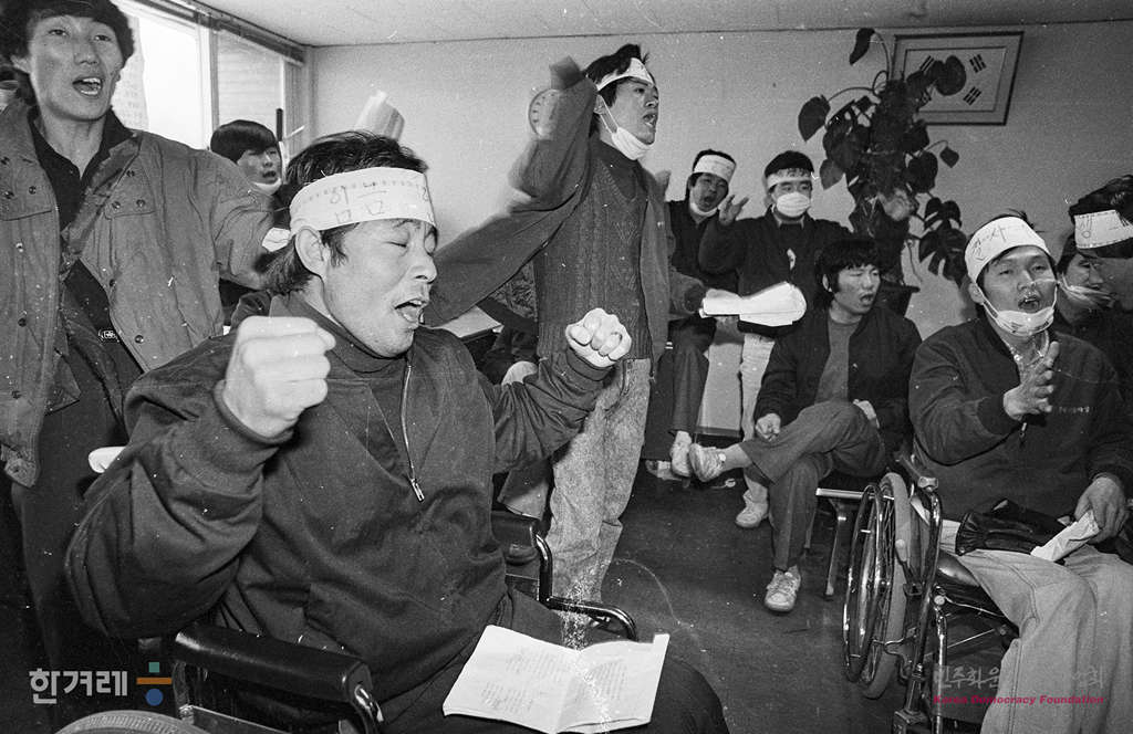 - 1989년 1월 20일 근로복지공사 반월 재활작업소에서 재활의 의지를 다지며 근무하는 산업재해 노동자들이 임금 인상과 영구직장 보장 등을 요구하며 시위를 벌이고 있다.