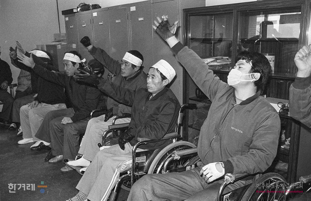 - 1989년 1월 20일 근로복지공사 반월 재활작업소에서 재활의 의지를 다지며 근무하는 산업재해 노동자들이 임금 인상과 영구직장 보장 등을 요구하며 시위를 벌이고 있다.