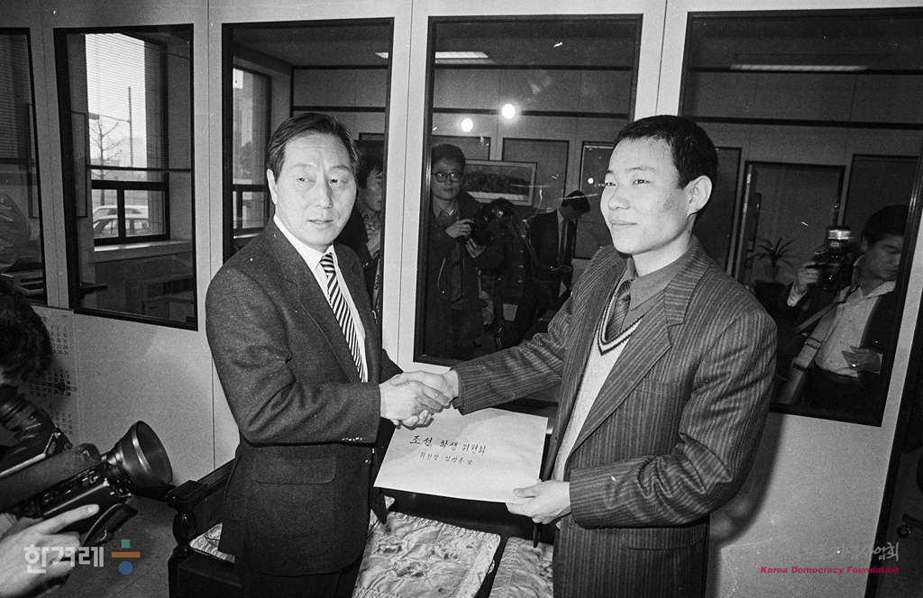 - 1989년 1월 20일 전대협 정명수 의장대행(오른쪽)이 적십자사를 방문하며 제13차 세계청년학생축전에 참가하겠는 내용이 담긴 북한 조선학생위원회에 보내는 서신을 정성근 이산사족 사업부장에게 전달하고 있다.