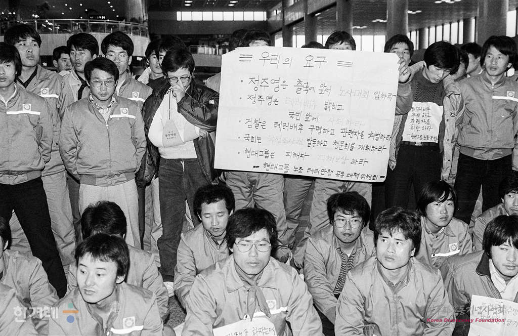 - 1989년 1월 21일 오전 10시 권용목 전 현대엔진 노조위원장을 비롯한 현대그룹 산하 12개사 노조위원장 등 노조원 58명은 서울 김포공항 국제선 제2청사 3층 출국장앞에서 박한 방문을 위해 출국하는 정주영 현대그룹 명예회장과의 면담을 요구하며 침묵시위를 벌이고 있다.