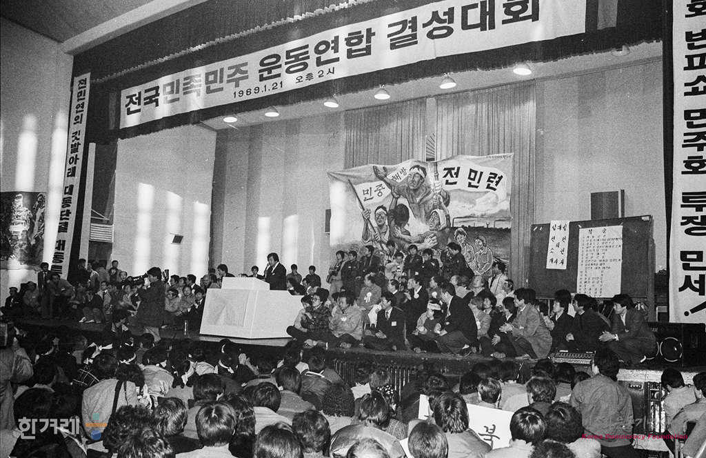 - 1989년 1월 21일 오후2시 재야 민족민주운동세력의 전국통합조직인 전국민족민주운동연합(전민련)이 서울 연세대 대강당에서 결성대회를 갖고 정식출범하고 있다. 서울민족민주운동협의회 등 지역통합단체 12개와 전국노동운동단체협의회 등 부문통합단체 8개등 모두 20갸의 참가단체로 출범한 전민련은 2백여개의 개별운동단체를 포괄하고 있어 건국이후 최대규모의 재야통합단체로 평가되고 있다.