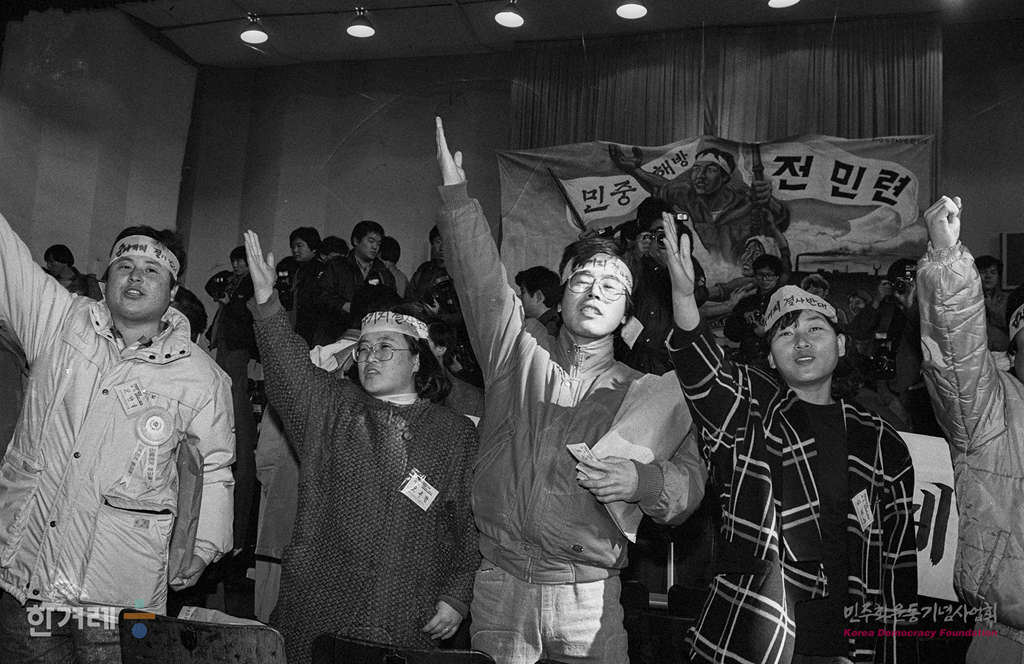 - 1989년 1월 21일 오후2시 재야 민족민주운동세력의 전국통합조직인 전국민족민주운동연합(전민련)이 서울 연세대 대강당에서 결성대회를 갖고 정식출범하고 있다. 서울민족민주운동협의회 등 지역통합단체 12개와 전국노동운동단체협의회 등 부문통합단체 8개등 모두 20갸의 참가단체로 출범한 전민련은 2백여개의 개별운동단체를 포괄하고 있어 건국이후 최대규모의 재야통합단체로 평가되고 있다.