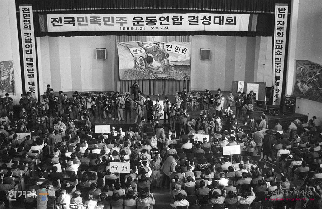 - 1989년 1월 21일 오후2시 재야 민족민주운동세력의 전국통합조직인 전국민족민주운동연합(전민련)이 서울 연세대 대강당에서 결성대회를 갖고 정식출범하고 있다. 서울민족민주운동협의회 등 지역통합단체 12개와 전국노동운동단체협의회 등 부문통합단체 8개등 모두 20갸의 참가단체로 출범한 전민련은 2백여개의 개별운동단체를 포괄하고 있어 건국이후 최대규모의 재야통합단체로 평가되고 있다.