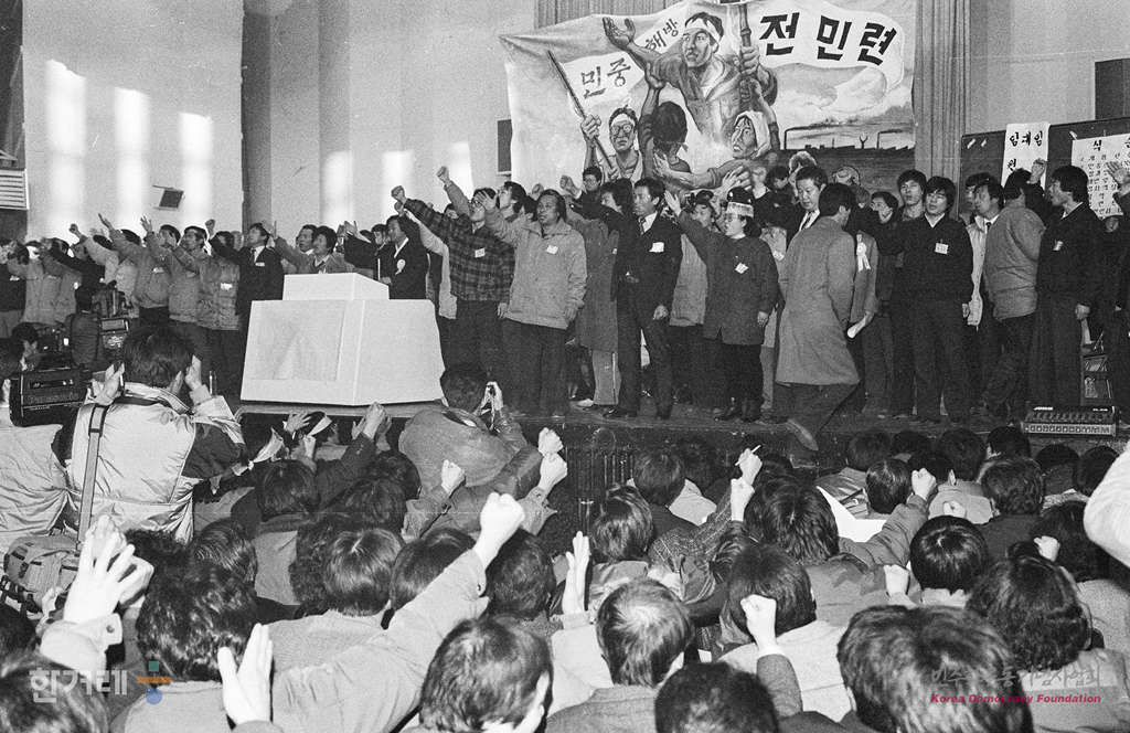 - 1989년 1월 21일 오후2시 재야 민족민주운동세력의 전국통합조직인 전국민족민주운동연합(전민련)이 서울 연세대 대강당에서 결성대회를 갖고 정식출범하고 있다. 서울민족민주운동협의회 등 지역통합단체 12개와 전국노동운동단체협의회 등 부문통합단체 8개등 모두 20갸의 참가단체로 출범한 전민련은 2백여개의 개별운동단체를 포괄하고 있어 건국이후 최대규모의 재야통합단체로 평가되고 있다.