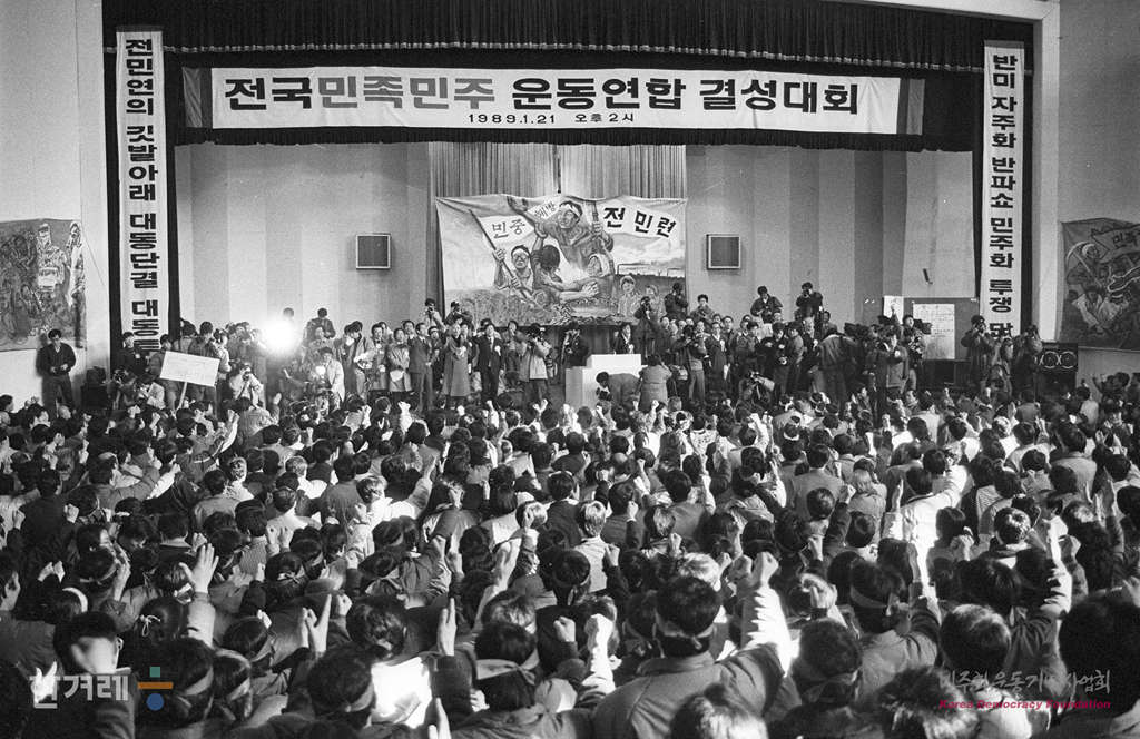 - 1989년 1월 21일 오후2시 재야 민족민주운동세력의 전국통합조직인 전국민족민주운동연합(전민련)이 서울 연세대 대강당에서 결성대회를 갖고 정식출범하고 있다. 서울민족민주운동협의회 등 지역통합단체 12개와 전국노동운동단체협의회 등 부문통합단체 8개등 모두 20갸의 참가단체로 출범한 전민련은 2백여개의 개별운동단체를 포괄하고 있어 건국이후 최대규모의 재야통합단체로 평가되고 있다.