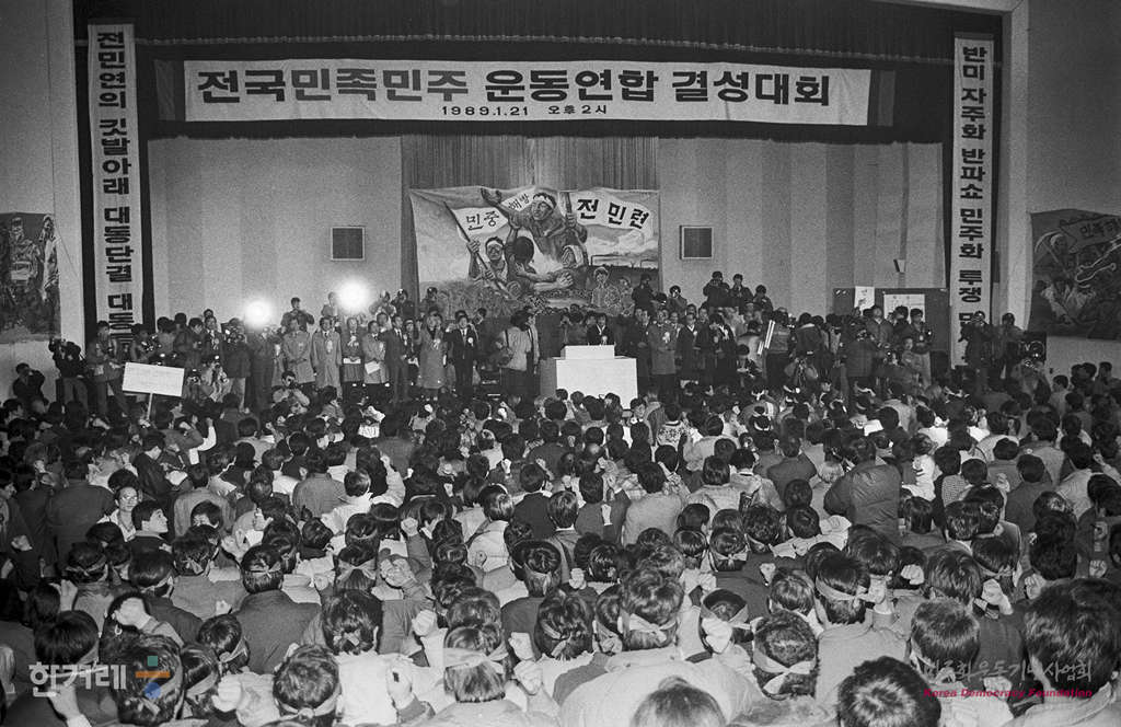 - 1989년 1월 21일 오후2시 재야 민족민주운동세력의 전국통합조직인 전국민족민주운동연합(전민련)이 서울 연세대 대강당에서 결성대회를 갖고 정식출범하고 있다. 서울민족민주운동협의회 등 지역통합단체 12개와 전국노동운동단체협의회 등 부문통합단체 8개등 모두 20갸의 참가단체로 출범한 전민련은 2백여개의 개별운동단체를 포괄하고 있어 건국이후 최대규모의 재야통합단체로 평가되고 있다.