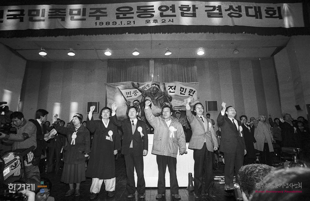 - 1989년 1월 21일 오후2시 재야 민족민주운동세력의 전국통합조직인 전국민족민주운동연합(전민련)이 서울 연세대 대강당에서 결성대회를 갖고 정식출범하고 있다. 서울민족민주운동협의회 등 지역통합단체 12개와 전국노동운동단체협의회 등 부문통합단체 8개등 모두 20갸의 참가단체로 출범한 전민련은 2백여개의 개별운동단체를 포괄하고 있어 건국이후 최대규모의 재야통합단체로 평가되고 있다.