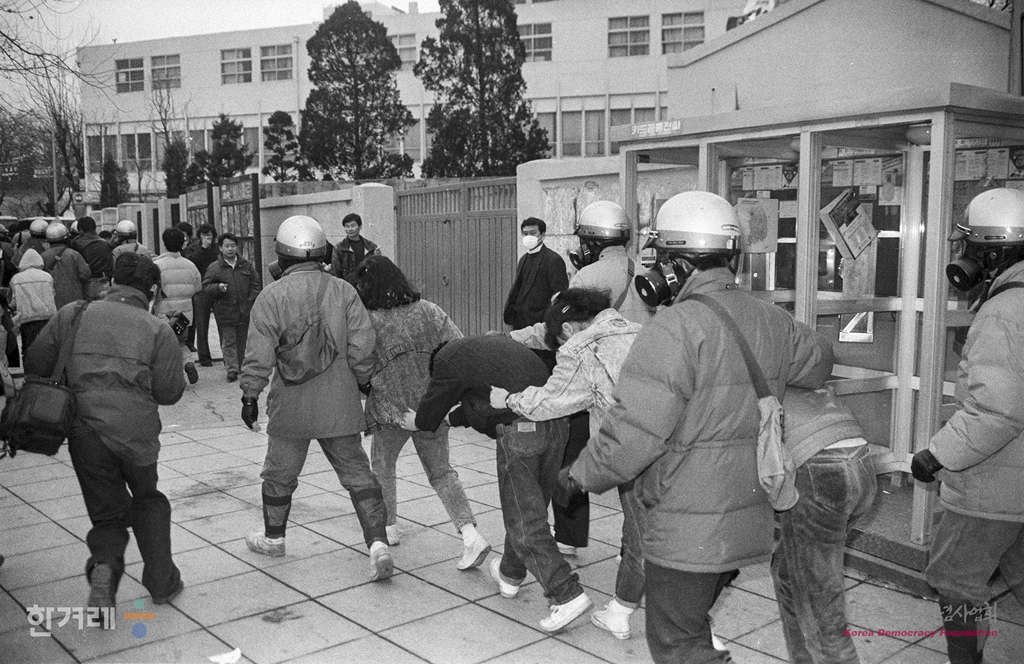 - 1989년 1월 22일 오후 2시 전국민족민주운동연합이 서울 종로구 동숭동 대학로에서 노태우정권의 민중운동탄압 및 폭력테러 규탄대회를 열고 행사를 마친 뒤 종로구 관훈동 민주정의당 당사까지 평화행진을 벌이려다 경찰의 제지를 받자 시내 중심가 곡곳에서 산발적인 시위를 벌이다 경찰에 연행되고 있다.