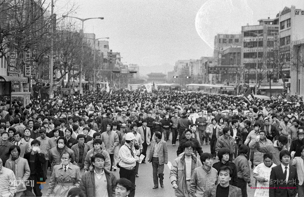 - 1989년 1월 22일 오후 2시 전국민족민주운동연합이 서울 종로구 동숭동 대학로에서 노태우정권의 민중운동탄압 및 폭력테러 규탄대회를 열고 행사를 마친 뒤 종로구 관훈동 민주정의당 당사까지 평화행진을 벌이려다 경찰의 제지를 받자 시내 중심가 곡곳에서 산발적인 시위를 벌이다 경찰에 연행되고 있다.