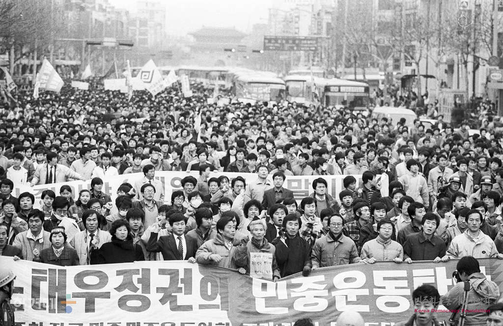 - 1989년 1월 22일 오후 2시 전국민족민주운동연합이 서울 종로구 동숭동 대학로에서 노태우정권의 민중운동탄압 및 폭력테러 규탄대회를 열고 행사를 마친 뒤 종로구 관훈동 민주정의당 당사까지 평화행진을 벌이려다 경찰의 제지를 받자 시내 중심가 곡곳에서 산발적인 시위를 벌이다 경찰에 연행되고 있다.