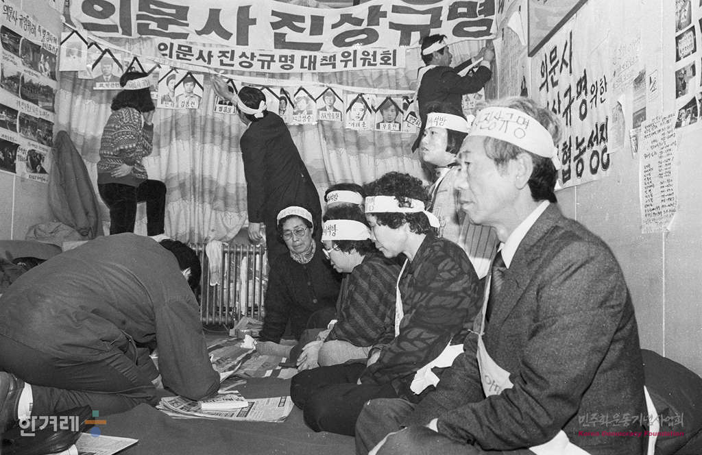 - 1989년 1월 25일 의문사 가족들이 의문사 진상규명과 법정모독 혐의로 구속된 임분이, 오영자씨의 석방을 요구하며 서울 종로구 종로5가 기독교회관에서 시작한 농성이 102일째를 맞이하고 있다.