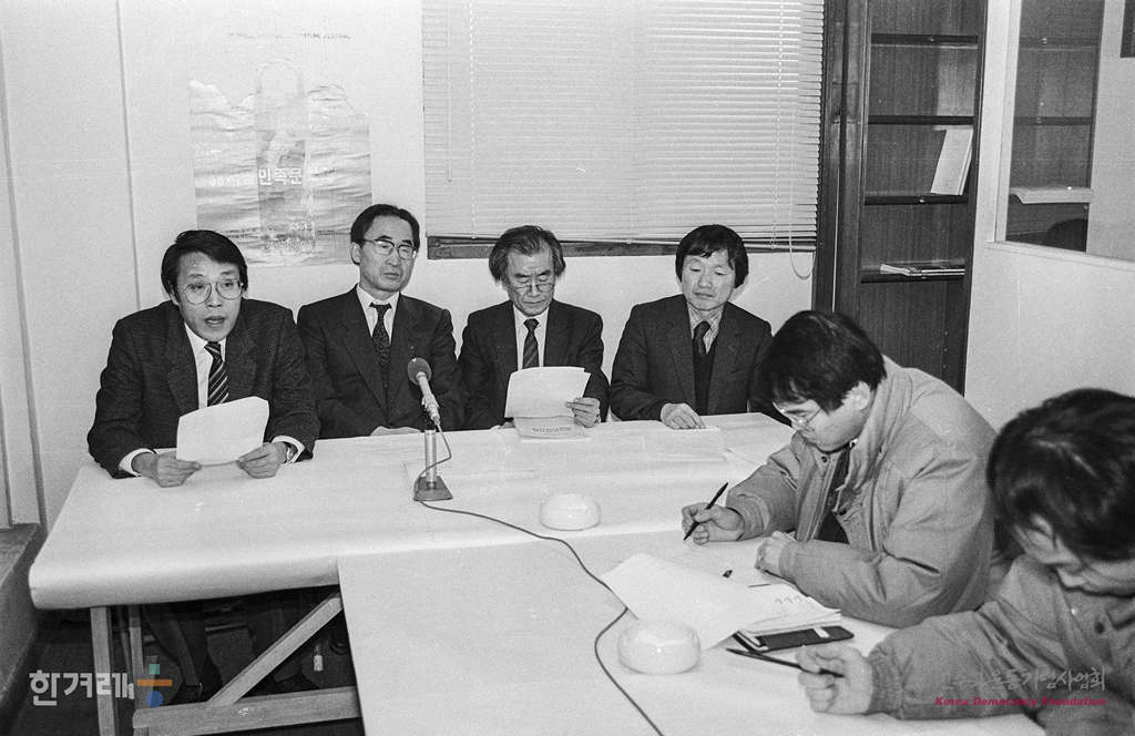 - 1989년 1월 25일 민예총 공동의장 김윤수, 고은씨와 대변인 황석영씨(맨 오른쪽)가 서울 종로구 관훈동 사무실에서 기자회견을 통해 상반기 활동방향을 밝히고 있다.