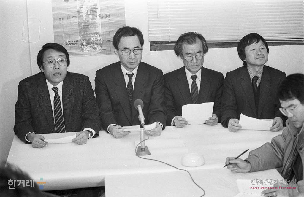 - 1989년 1월 25일 민예총 공동의장 김윤수, 고은씨와 대변인 황석영씨(맨 오른쪽)가 서울 종로구 관훈동 사무실에서 기자회견을 통해 상반기 활동방향을 밝히고 있다.