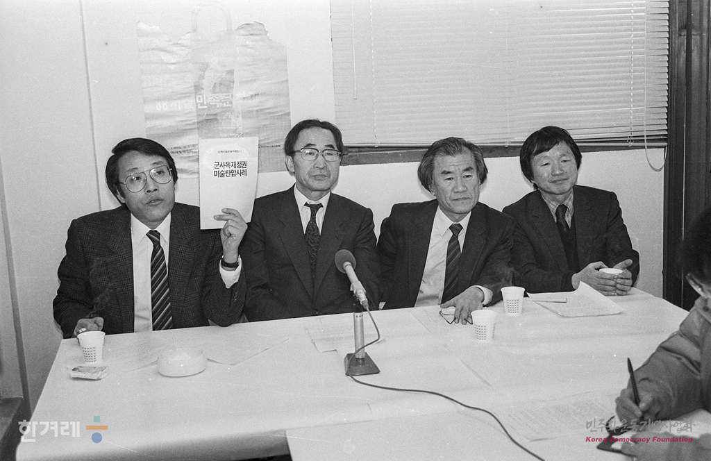 - 1989년 1월 25일 민예총 공동의장 김윤수, 고은씨와 대변인 황석영씨(맨 오른쪽)가 서울 종로구 관훈동 사무실에서 기자회견을 통해 상반기 활동방향을 밝히고 있다.