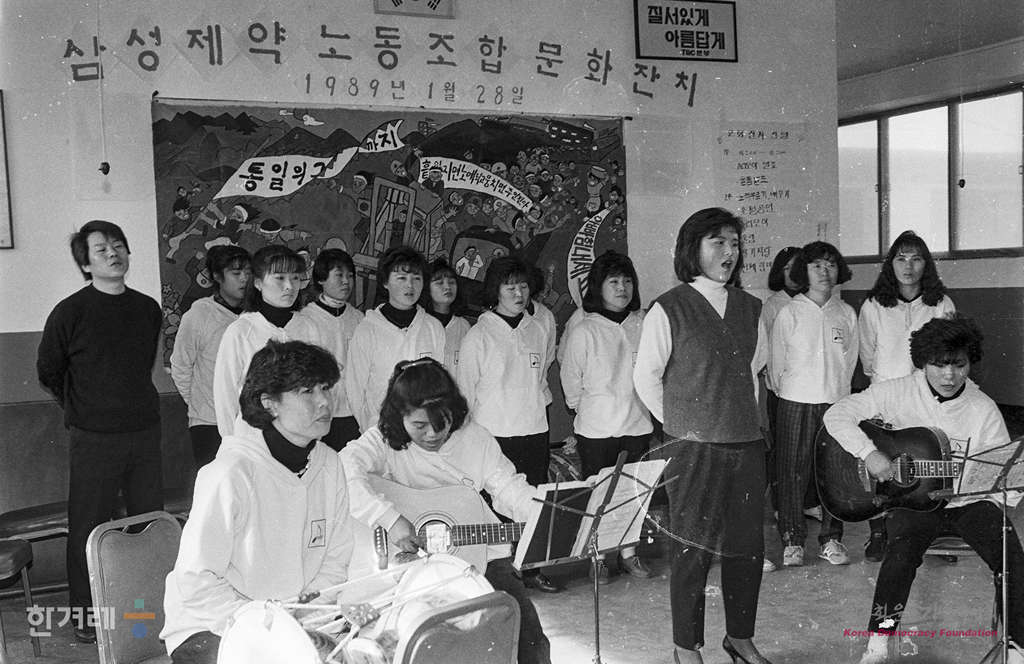 - 1989년 1월 28일 지난해 4월 27일간의 장기파업을 통해 임금인상 투쟁을 벌였던 삼성제약 노조가 흥겨운 노조문화잔치를 열려 노조원과 초청인사 1백여명이 즐거운 시간을 갖고 잇다. 삼성제약 노조는 75년 이후 서울 동부권에서 유일한 민주노조로 활동을 계속해 온 존통있는 노조답게 구사대의 폭력에도 버텨 결국 임금인상을 관철시켰다.