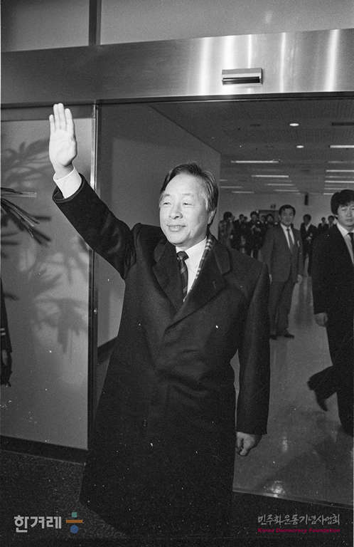 - 1989년 1월 30일 김영삼 민주당 총재는 김포공항에서 일본 다케시타 노보루 일본수상과 단독회담을 하기 위해 일본으로 떠나기 앞서 환송한 사람들에게 손을 들어 인사를 하고 있다.