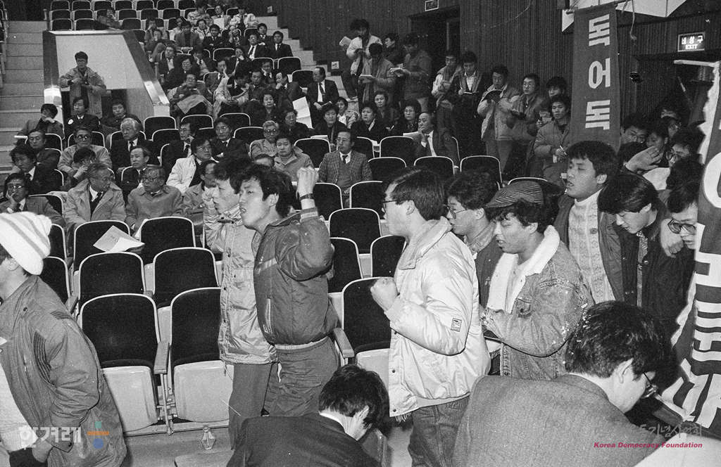 - 1989년 2월1일 총장 선출과정 참여를 요구하는 고려대 강사, 조교, 학생 등 5백여명이 교수협의회가 열리고 있는 과학도서관 강당으로 들어서고 있다. 고려대는 교수협의회는 교수들이 뽑은 2명의 총장 후보자중 1명을 재단이 임명하는 종전의 선출방법을 주장하고 있으나 강사노조, 조교협의회, 대학원 총학생회, 학부 총학생회등 4개 단체는 교수협의회를 제외한 학내 자치단체로 구성된 총장선출 여론수렴위원회에서 과반수의 반대표를 얻은 후보는 총장을 결정하는 교수들의 최종투표에 나갈수 없다고 맞서고 있다.