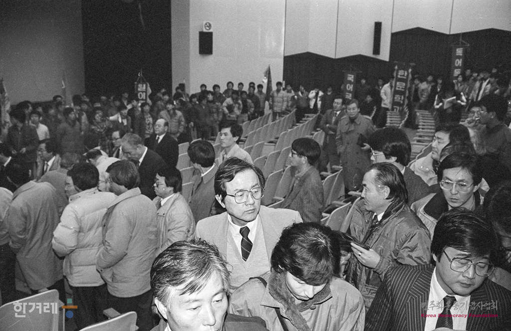 - 1989년 2월1일 총장 선출과정 참여를 요구하는 고려대 강사, 조교, 학생 등 5백여명이 교수협의회가 열리고 있는 과학도서관 강당으로 들어서고 있다. 고려대는 교수협의회는 교수들이 뽑은 2명의 총장 후보자중 1명을 재단이 임명하는 종전의 선출방법을 주장하고 있으나 강사노조, 조교협의회, 대학원 총학생회, 학부 총학생회등 4개 단체는 교수협의회를 제외한 학내 자치단체로 구성된 총장선출 여론수렴위원회에서 과반수의 반대표를 얻은 후보는 총장을 결정하는 교수들의 최종투표에 나갈수 없다고 맞서고 있다.