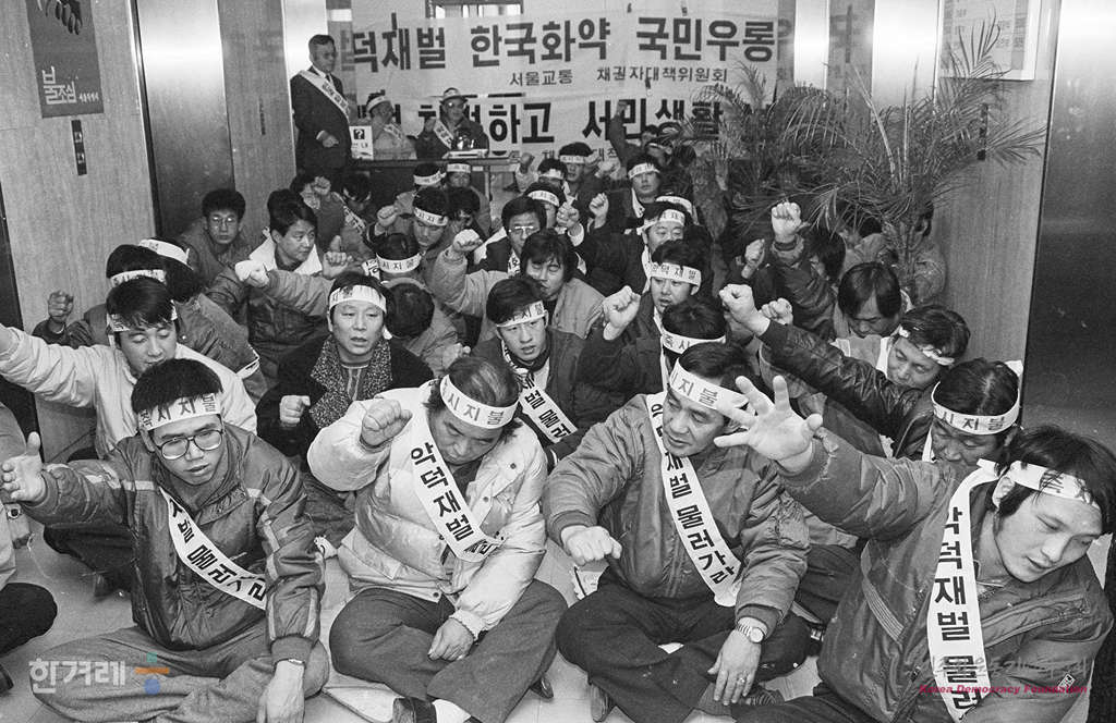 - 1989년 2월 1일 옛 명성그룹 계열 전세버스 운송업체인 서울교통공사 채권자대책위원회 회원들이 한국화약 위장계열사과 관련해 밀린 채권에 대한 즉시 지불을 요구하며 농성을 하고 있다.