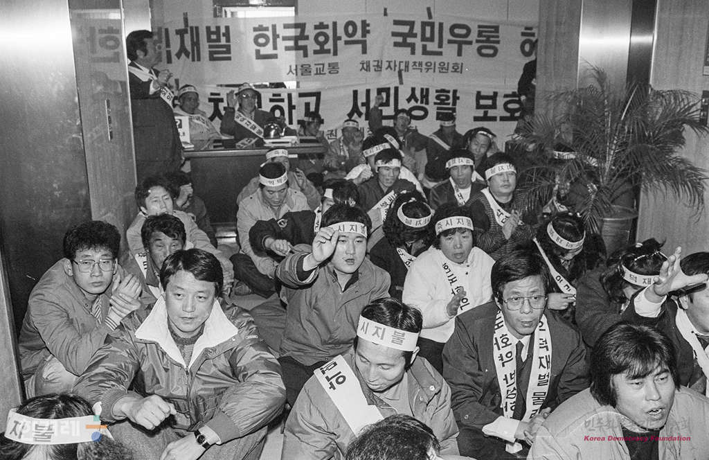- 1989년 2월 1일 옛 명성그룹 계열 전세버스 운송업체인 서울교통공사 채권자대책위원회 회원들이 한국화약 위장계열사과 관련해 밀린 채권에 대한 즉시 지불을 요구하며 농성을 하고 있다.
