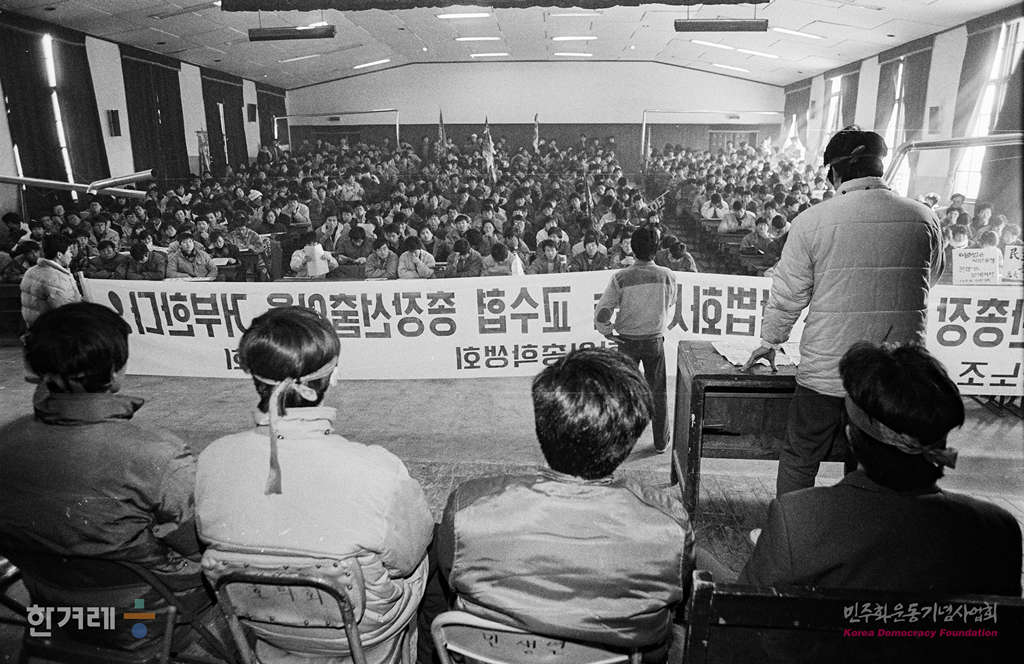 - 1989년 2월1일 총장 선출과정 참여를 요구하는 고려대 강사, 조교, 학생 등 5백여명이 교수협의회가 열리고 있는 과학도서관 강당으로 들어서고 있다. 고려대는 교수협의회는 교수들이 뽑은 2명의 총장 후보자중 1명을 재단이 임명하는 종전의 선출방법을 주장하고 있으나 강사노조, 조교협의회, 대학원 총학생회, 학부 총학생회등 4개 단체는 교수협의회를 제외한 학내 자치단체로 구성된 총장선출 여론수렴위원회에서 과반수의 반대표를 얻은 후보는 총장을 결정하는 교수들의 최종투표에 나갈수 없다고 맞서고 있다.