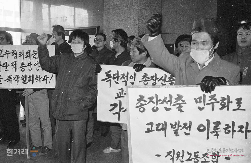 - 1989년 2월1일 총장 선출과정 참여를 요구하는 고려대 강사, 조교, 학생 등 5백여명이 교수협의회가 열리고 있는 과학도서관 강당으로 들어서고 있다. 고려대는 교수협의회는 교수들이 뽑은 2명의 총장 후보자중 1명을 재단이 임명하는 종전의 선출방법을 주장하고 있으나 강사노조, 조교협의회, 대학원 총학생회, 학부 총학생회등 4개 단체는 교수협의회를 제외한 학내 자치단체로 구성된 총장선출 여론수렴위원회에서 과반수의 반대표를 얻은 후보는 총장을 결정하는 교수들의 최종투표에 나갈수 없다고 맞서고 있다.