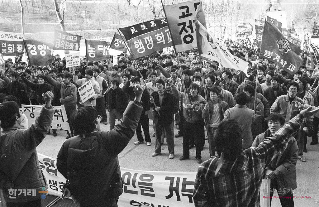- 1989년 2월1일 총장 선출과정 참여를 요구하는 고려대 강사, 조교, 학생 등 5백여명이 교수협의회가 열리고 있는 과학도서관 강당으로 들어서고 있다. 고려대는 교수협의회는 교수들이 뽑은 2명의 총장 후보자중 1명을 재단이 임명하는 종전의 선출방법을 주장하고 있으나 강사노조, 조교협의회, 대학원 총학생회, 학부 총학생회등 4개 단체는 교수협의회를 제외한 학내 자치단체로 구성된 총장선출 여론수렴위원회에서 과반수의 반대표를 얻은 후보는 총장을 결정하는 교수들의 최종투표에 나갈수 없다고 맞서고 있다.