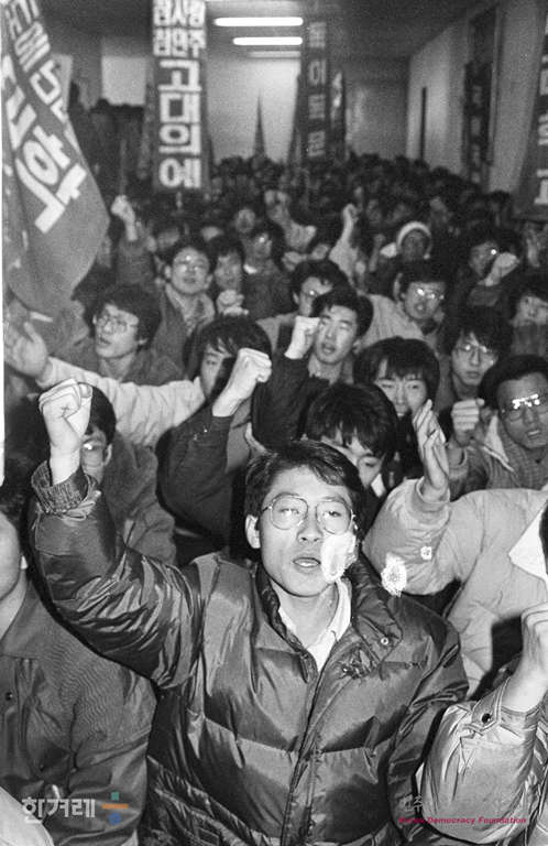 - 1989년 2월1일 총장 선출과정 참여를 요구하는 고려대 강사, 조교, 학생 등 5백여명이 교수협의회가 열리고 있는 과학도서관 강당으로 들어서고 있다. 고려대는 교수협의회는 교수들이 뽑은 2명의 총장 후보자중 1명을 재단이 임명하는 종전의 선출방법을 주장하고 있으나 강사노조, 조교협의회, 대학원 총학생회, 학부 총학생회등 4개 단체는 교수협의회를 제외한 학내 자치단체로 구성된 총장선출 여론수렴위원회에서 과반수의 반대표를 얻은 후보는 총장을 결정하는 교수들의 최종투표에 나갈수 없다고 맞서고 있다.