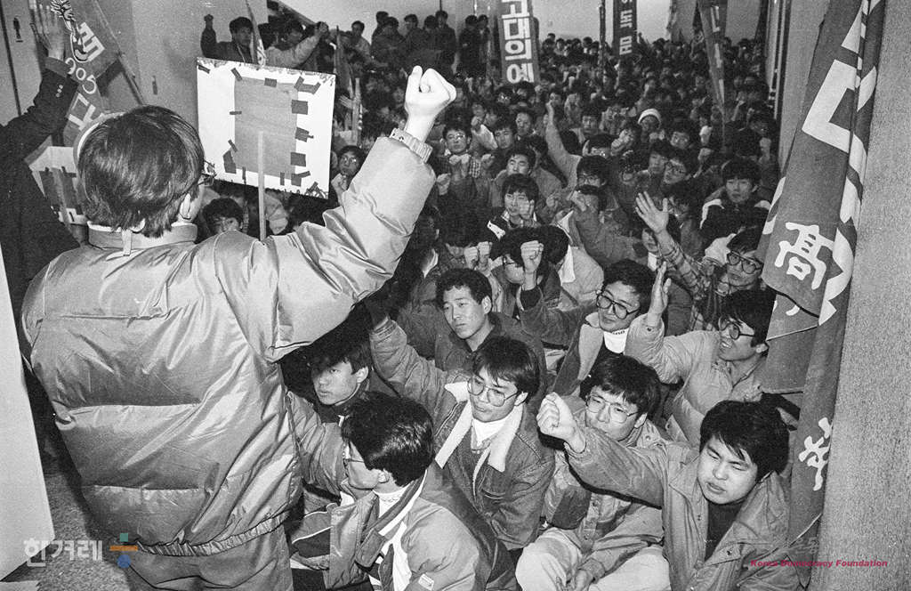 - 1989년 2월1일 총장 선출과정 참여를 요구하는 고려대 강사, 조교, 학생 등 5백여명이 교수협의회가 열리고 있는 과학도서관 강당으로 들어서고 있다. 고려대는 교수협의회는 교수들이 뽑은 2명의 총장 후보자중 1명을 재단이 임명하는 종전의 선출방법을 주장하고 있으나 강사노조, 조교협의회, 대학원 총학생회, 학부 총학생회등 4개 단체는 교수협의회를 제외한 학내 자치단체로 구성된 총장선출 여론수렴위원회에서 과반수의 반대표를 얻은 후보는 총장을 결정하는 교수들의 최종투표에 나갈수 없다고 맞서고 있다.