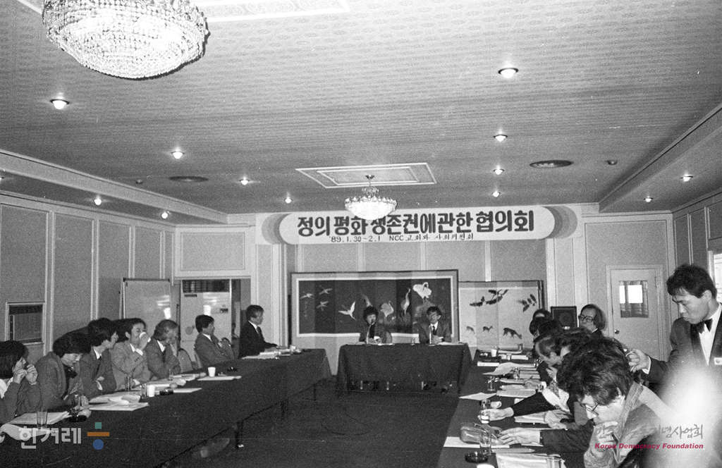- 1989년 2월 1일 한국기독교협의회 산하 교회와 사회위원회(교사위)가 정의 평화 생존권에 관한 정책협의회를 열고 최장집 교수가 강연을 하고 있다.