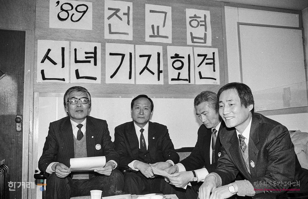 - 1989년 2월 2일 교육관계법 개정이 국회에서 추진되고 있는 가운데 전국교사협의회 회장단이 기자회견을 갖고 올 상반기 교원노조 결성할 계획을 발표하고 있다.