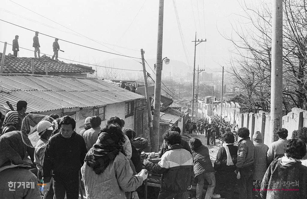 - 1989년 2월 2일 서울 성북구 동소문동 재개발 지역에서 경찰 5개 중대의 지원을 받은 철거반원과 이를 저지하려는 세입자들이 골목길에서 대치하고 있다.