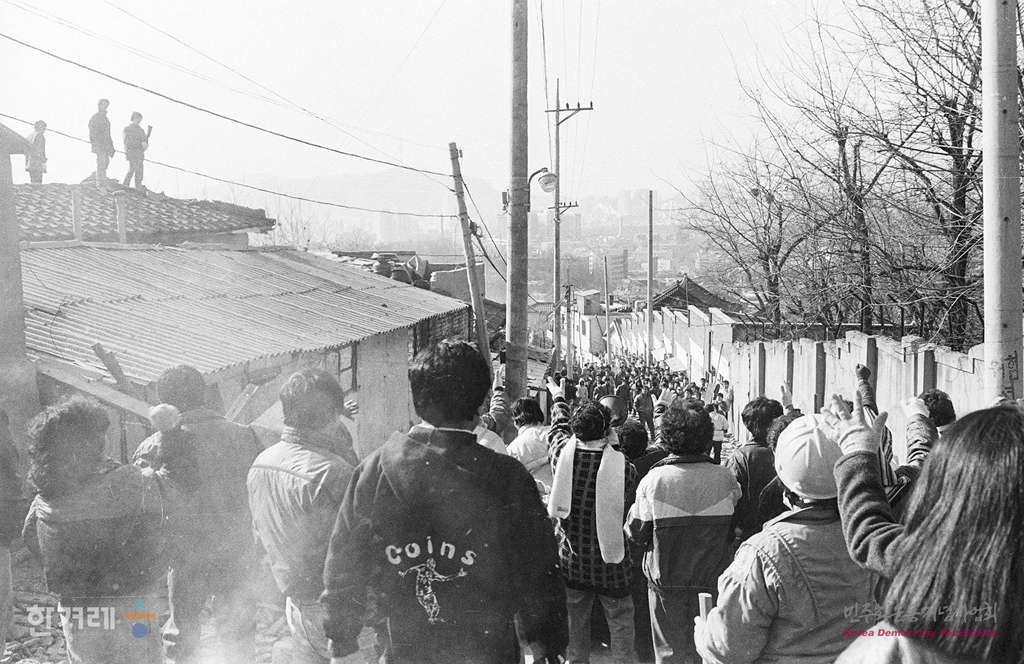 - 1989년 2월 2일 서울 성북구 동소문동 재개발 지역에서 경찰 5개 중대의 지원을 받은 철거반원과 이를 저지하려는 세입자들이 골목길에서 대치하고 있다.