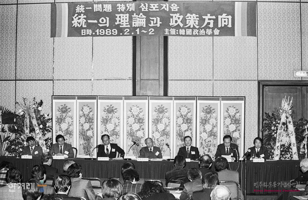 - 1989년 2월 1일 한국정치학회는 서울 힐튼호텔에서 통일문제 특별 심포지움을 열어 통일에 대한 전문가들의 이론적인 접근 및 각 정당 사회단체의 통일방안 발표를 듣고 토론을 벌이고 있다.