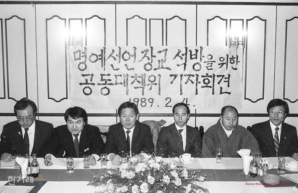 - 1989년 2월 4일 명예선언장교 석방을 위한 공동대책위 회원들이 서울 세실레스토랑에서 조속한 석방을 요구하며 기자회견을 하고 있다. 지난 1월 5일 군의 정치적 중립등을 요구하는 선언을 한 뒤 구속이 되어있던 육군제30사단 공병대대 소속 이동균대위 등 장교 5명은 전원이 불기소처분에 따라 28일만인 4일 풀려났다.