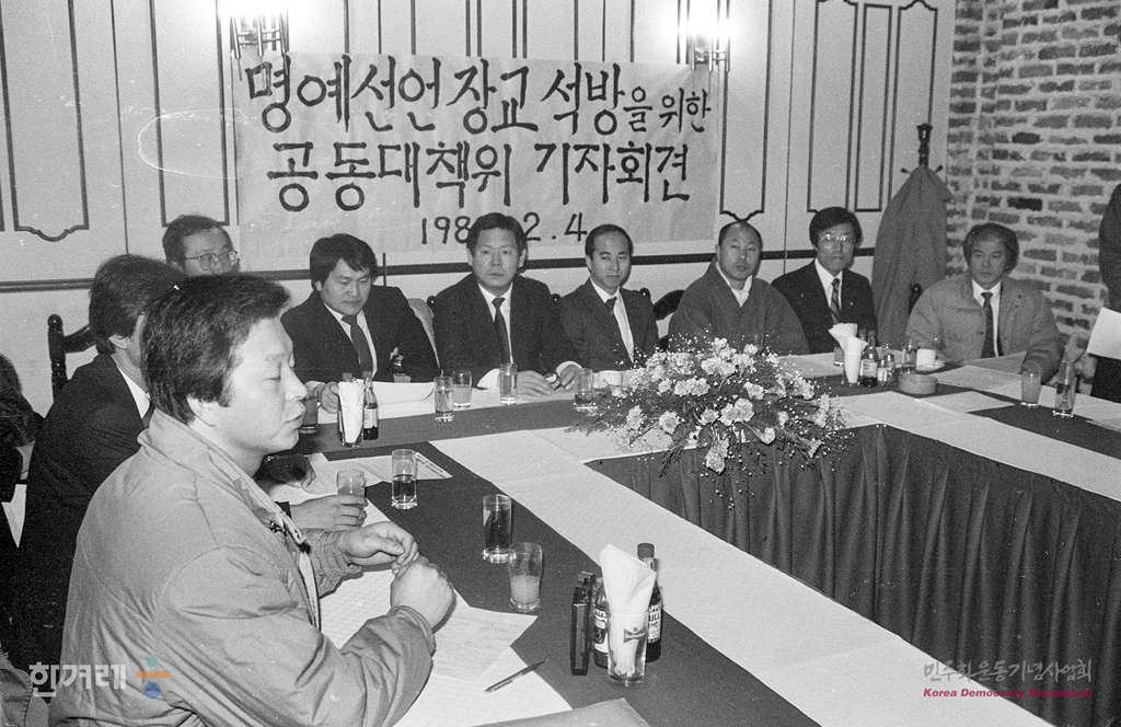 - 1989년 2월 4일 명예선언장교 석방을 위한 공동대책위 회원들이 서울 세실레스토랑에서 조속한 석방을 요구하며 기자회견을 하고 있다. 지난 1월 5일 군의 정치적 중립등을 요구하는 선언을 한 뒤 구속이 되어있던 육군제30사단 공병대대 소속 이동균대위 등 장교 5명은 전원이 불기소처분에 따라 28일만인 4일 풀려났다.