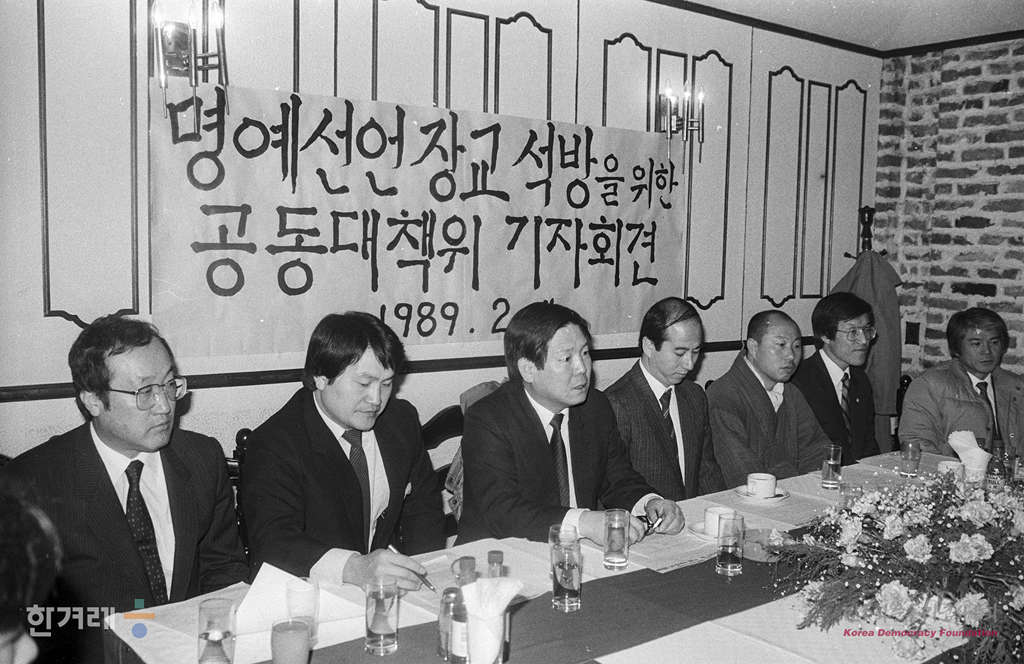 - 1989년 2월 4일 명예선언장교 석방을 위한 공동대책위 회원들이 서울 세실레스토랑에서 조속한 석방을 요구하며 기자회견을 하고 있다. 지난 1월 5일 군의 정치적 중립등을 요구하는 선언을 한 뒤 구속이 되어있던 육군제30사단 공병대대 소속 이동균대위 등 장교 5명은 전원이 불기소처분에 따라 28일만인 4일 풀려났다.