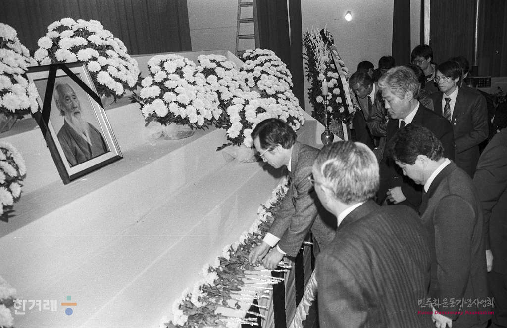 - 1989년 2월 8일 오전 10시 고 함석헌선생의 영결식이 모교인 서울 용산구 보광동 오산고 강당에서 오산학교장으로 열려 정부 및 정계인사들과 김수환추기경을 비롯한 문익환 계훈씨씨등 각계인사들과 학생 2천여명이 참석한 가운데 열리고 있다.