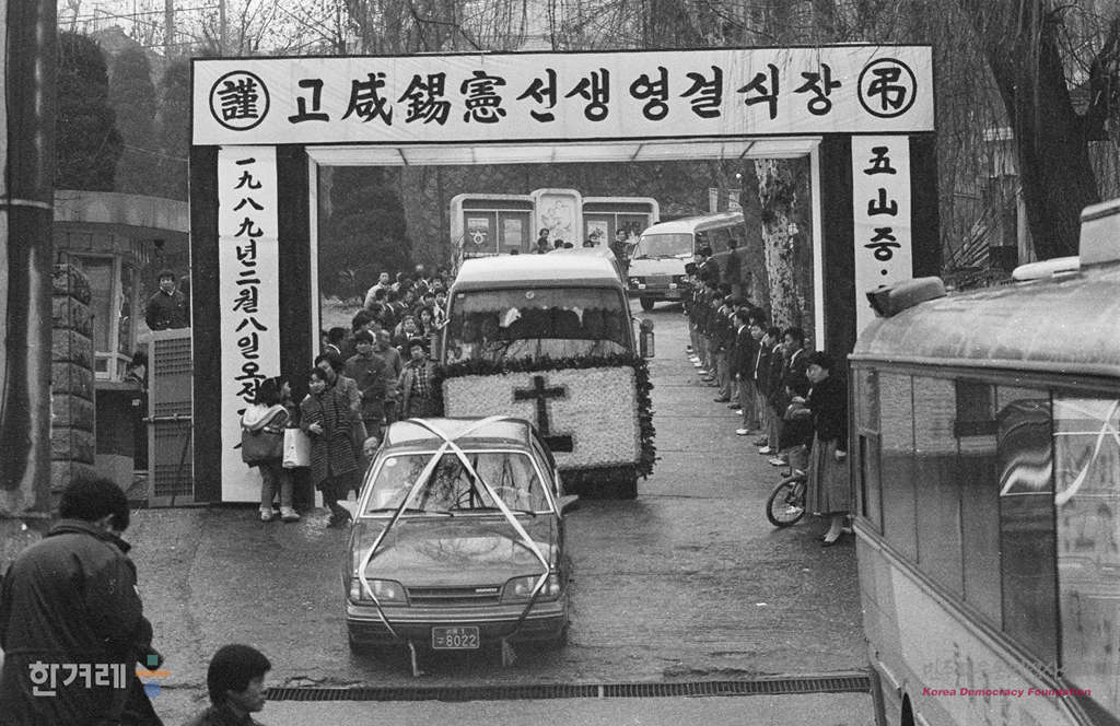 - 1989년 2월 8일 오전 10시 고 함석헌선생의 영결식이 모교인 서울 용산구 보광동 오산고 강당에서 오산학교장으로 열려 정부 및 정계인사들과 김수환추기경을 비롯한 문익환 계훈씨씨등 각계인사들과 학생 2천여명이 참석한 가운데 열리고 있다.