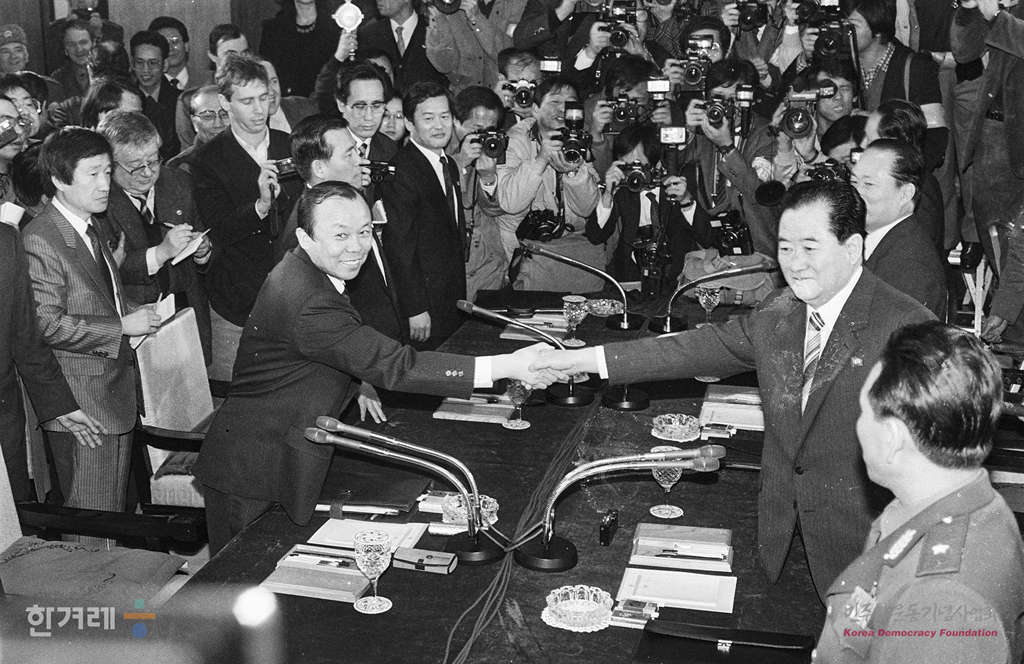- 1989년2월 8일 10시 남북총리회담을 위한 차관급의 예비회담이 판문점 남쪽 지역 평화의 집에서 열려 남의 송한호 수석대회와 북의 백남준 단장이 인사를 나누고 회의를 하고 있다.