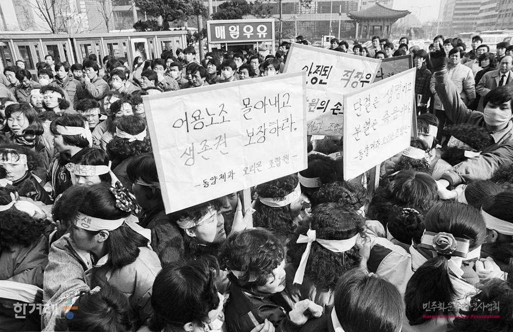 - 1989년 2월 9일 동양제과 노동조합 조합원들이 서울 세종문화회관에서 어용노조 반대외 부당해고 철회를 요구하며 집회를 가진 뒤 거리행진을 시도하다 경찰의 제제를 받고 있다.